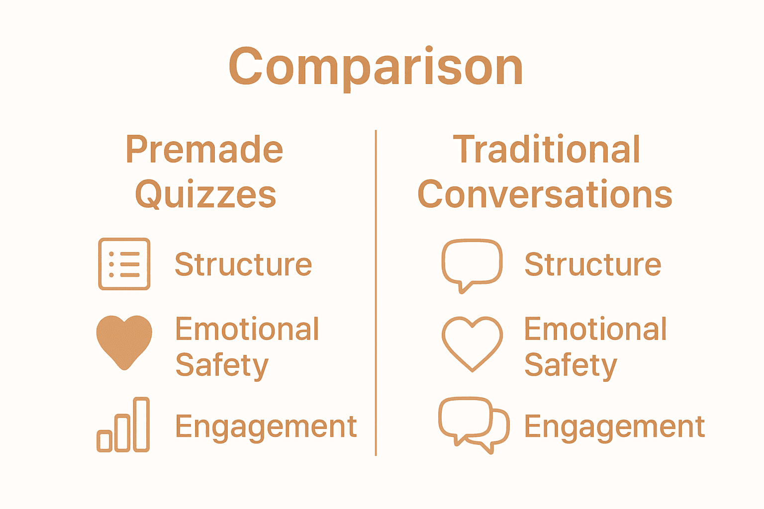 To clarify the unique advantages of premade quizzes in relationships, here is a table outlining how they foster communication by transforming conversation settings, improving safety, and encouraging openness.
